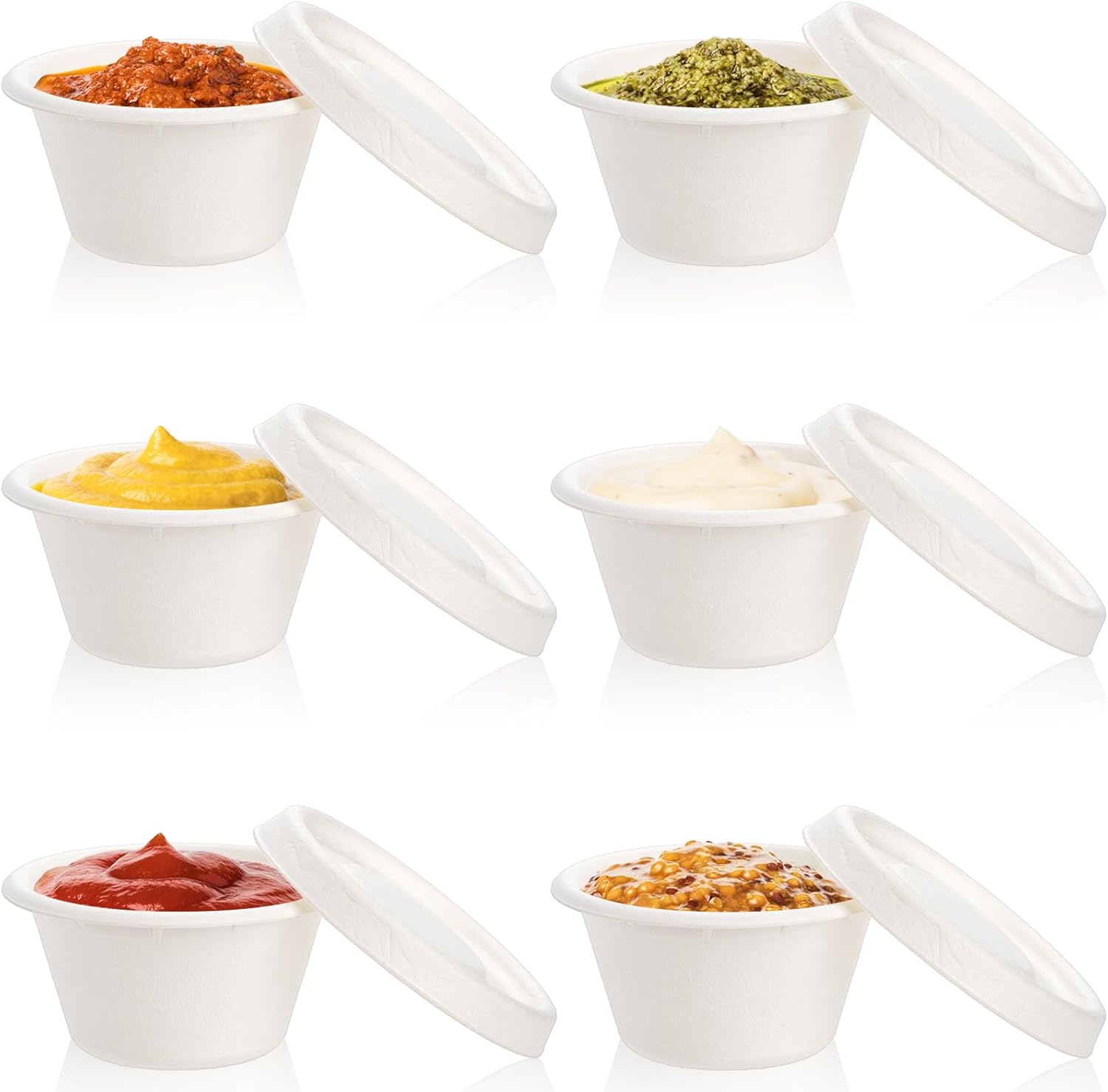 - CONVENIENT: These small 2-ounce cups with lids are more than just souffle cups. They are the perfect eco-friendly option to distribute FOOD TASTING SAMPLES and SNACKS in. They are also ideal for CONDIMENTS, SAUCES, DRESSINGS, DIPS, JELLO SHOTS, or even ICE CREAM! Additionally, they are stackable which makes them easy to store and transport!